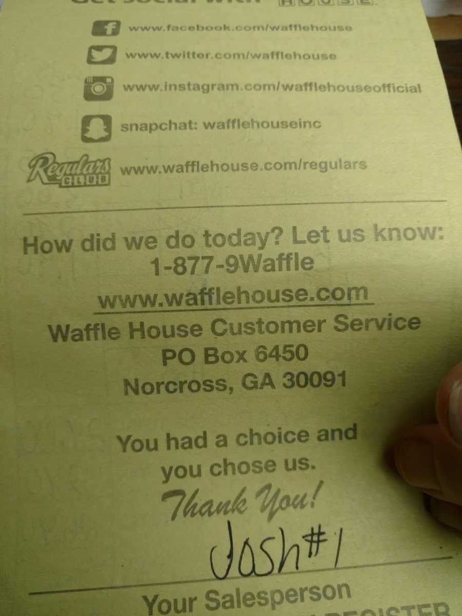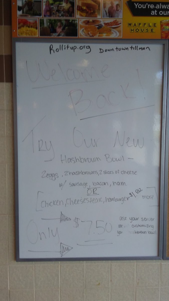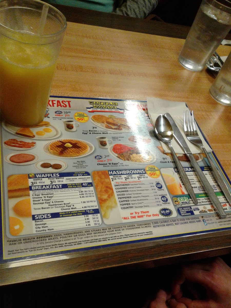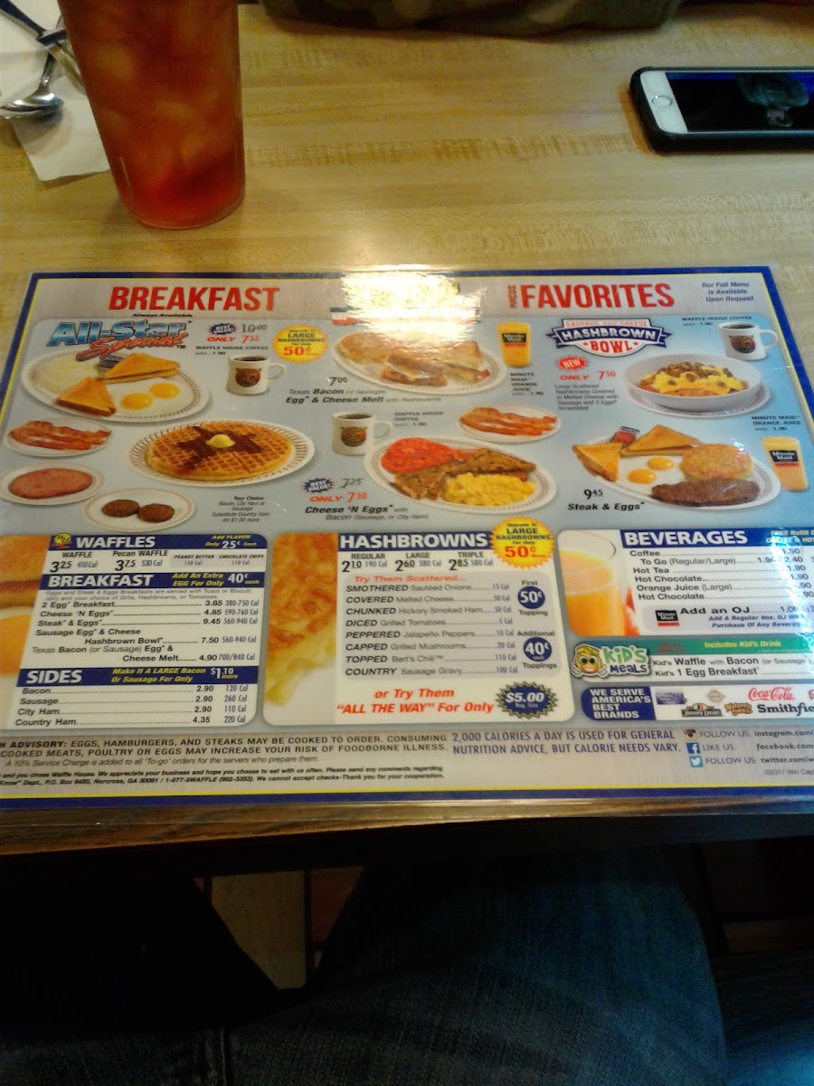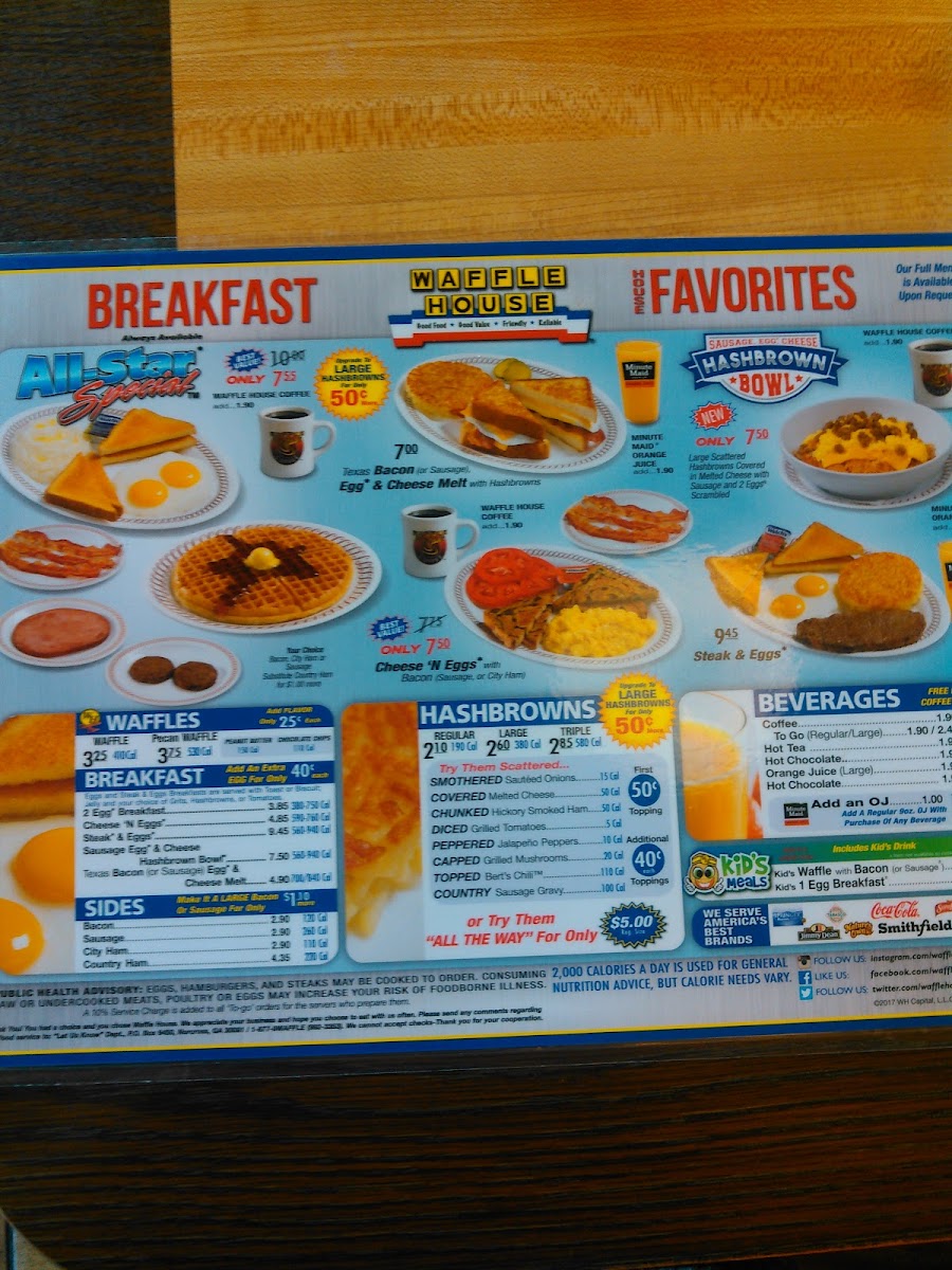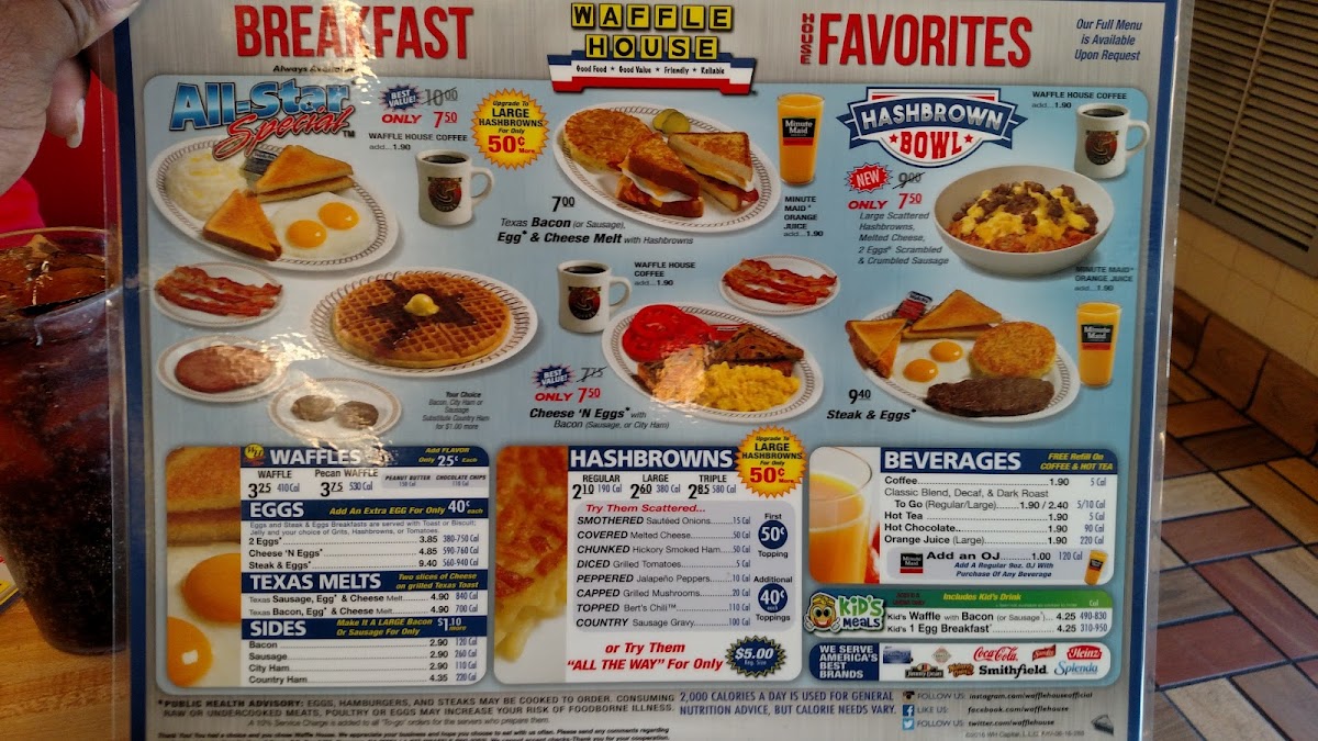 Eggs with Toast & Jelly; choice of Grits, Hashbrowns or Sliced Tomatoes; a Waffle and Your Choice of Meat; 3 Slices of Smithfield® Bacon, 2 Patties of Jimmy Dean® Sausage or Hickory Smoked Ham